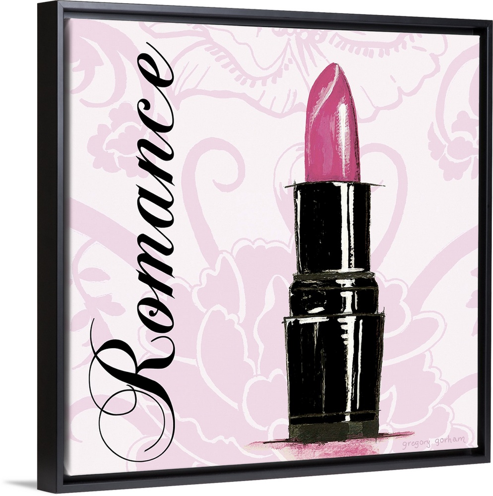 <p>Decorative square art with a pink floral background and an illustration of a tube of lipstick with the word "Romance" written on the side in black.</p>
