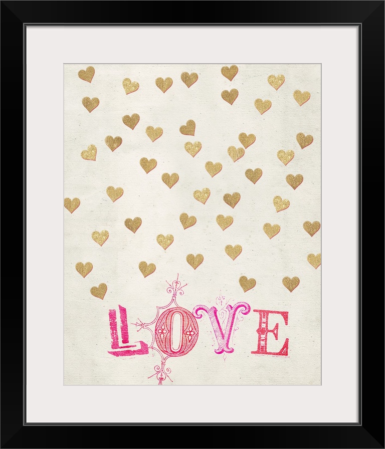 <p>Golden hearts and the word Love in pink against a weathered neutral background.</p>