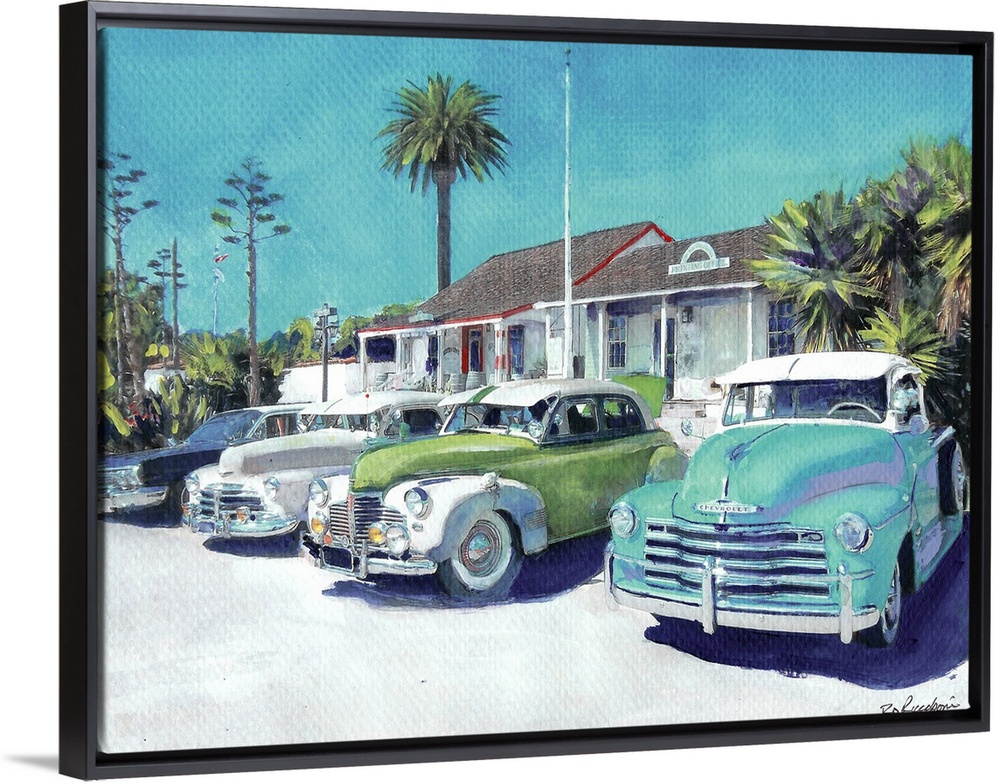 <p>Contemporary painting of vintage cars parked outside in Old Town San Diego, California.</p>