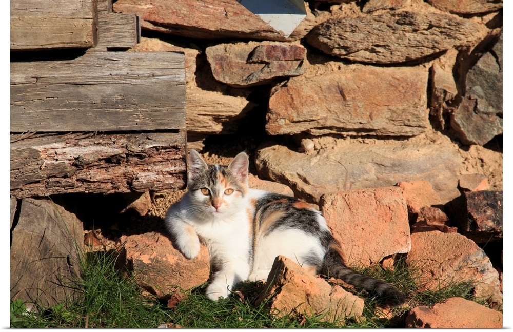 <p>Romania Maramures County, Dobricu Lapusului. Cat leaning against stone wall.</p>