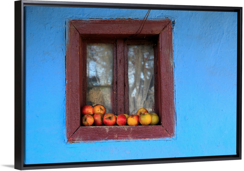 <p>Romania Maramures County, Dobricu Lapusului. Typical Farm house, blue color. Window with apples.</p>