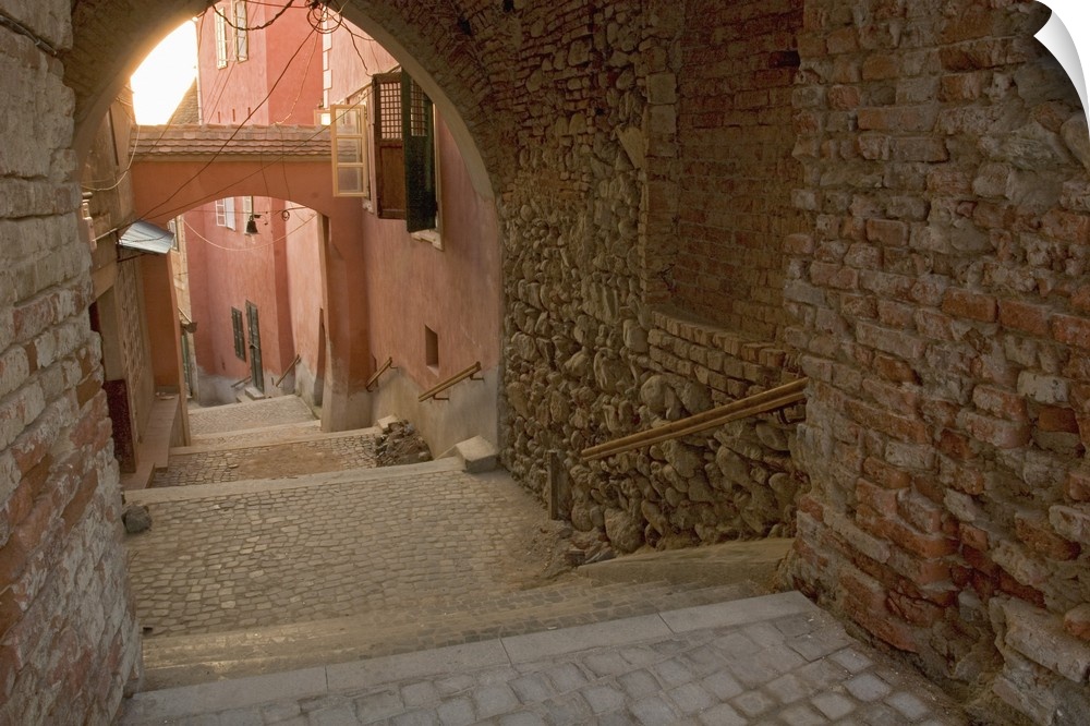 <p>Romania, Sibiu, Walk way from the Big Square of the old city to the lower part of the medieval city,The foundation of the city of Sibiu was set in 1160 by the person of Hermann from Nurnberg and the town was refered to as villa Hermanni. One of the earliest known references to Sibiu comes in a papal bull dated 1191, in which Pope Celestin III gave the Saxons permission to organize their own ecclesiastical community</p>