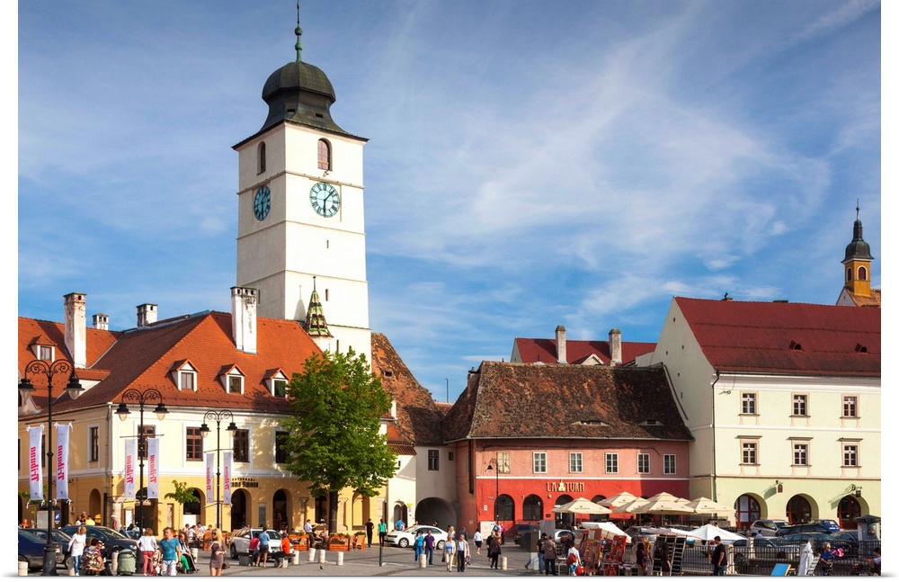 <p>Romania, Transylvania, Sibiu, Piata Mica Square and Council Tower.</p>