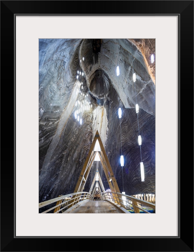 <p>Romania, Transylvania, Cluj-Napoca. The bridge to the boating lake in the Terezia Mine at Salina Turda - a historic salt mine disused since the early 20th Century and converted into a futuristic theme park. Open to tourists since 1992 it was extensively modernized to its current format in 2008.</p>