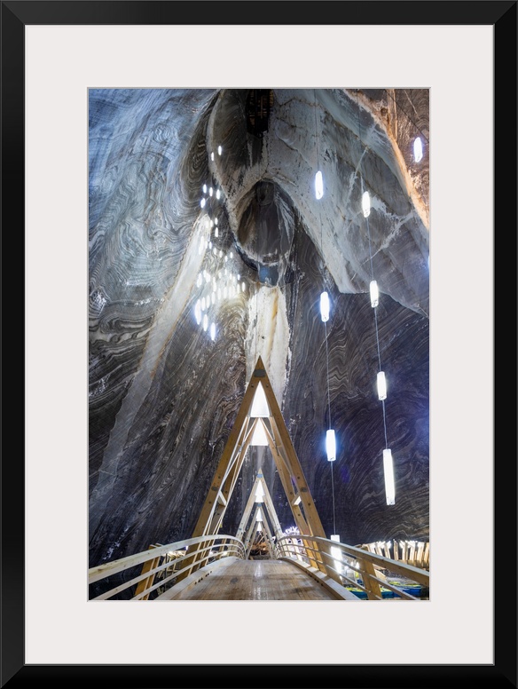<p>Romania, Transylvania, Cluj-Napoca. The bridge to the boating lake in the Terezia Mine at Salina Turda - a historic salt mine disused since the early 20th Century and converted into a futuristic theme park. Open to tourists since 1992 it was extensively modernized to its current format in 2008.</p>
