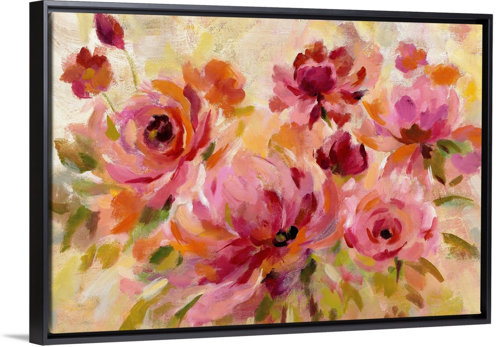 <p>Abstract painting of a bouquet of warm pink flowers with hints of orange.</p>