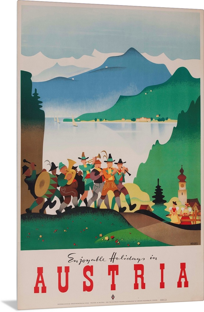 <p>A musical band in traditional clothing parades in front of a lakeside town. ca 1950s</p>