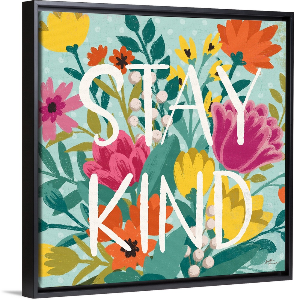 <p>This decorative artwork features the words, 'Stay Kind' over a blue polka dot background with sprouting flowers.</p>