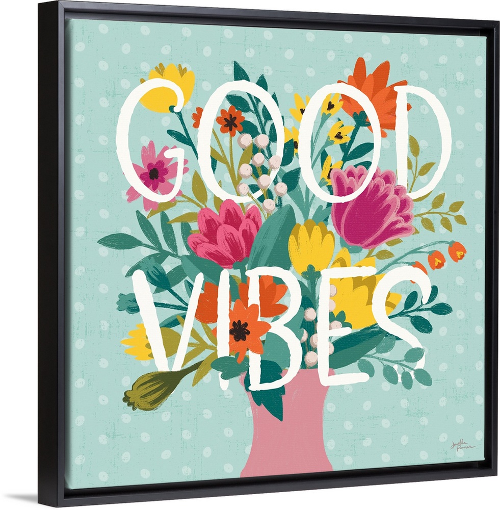 <p>This decorative artwork features the words, 'Good Vibes' over a blue polka dot background with sprouting flowers.</p>