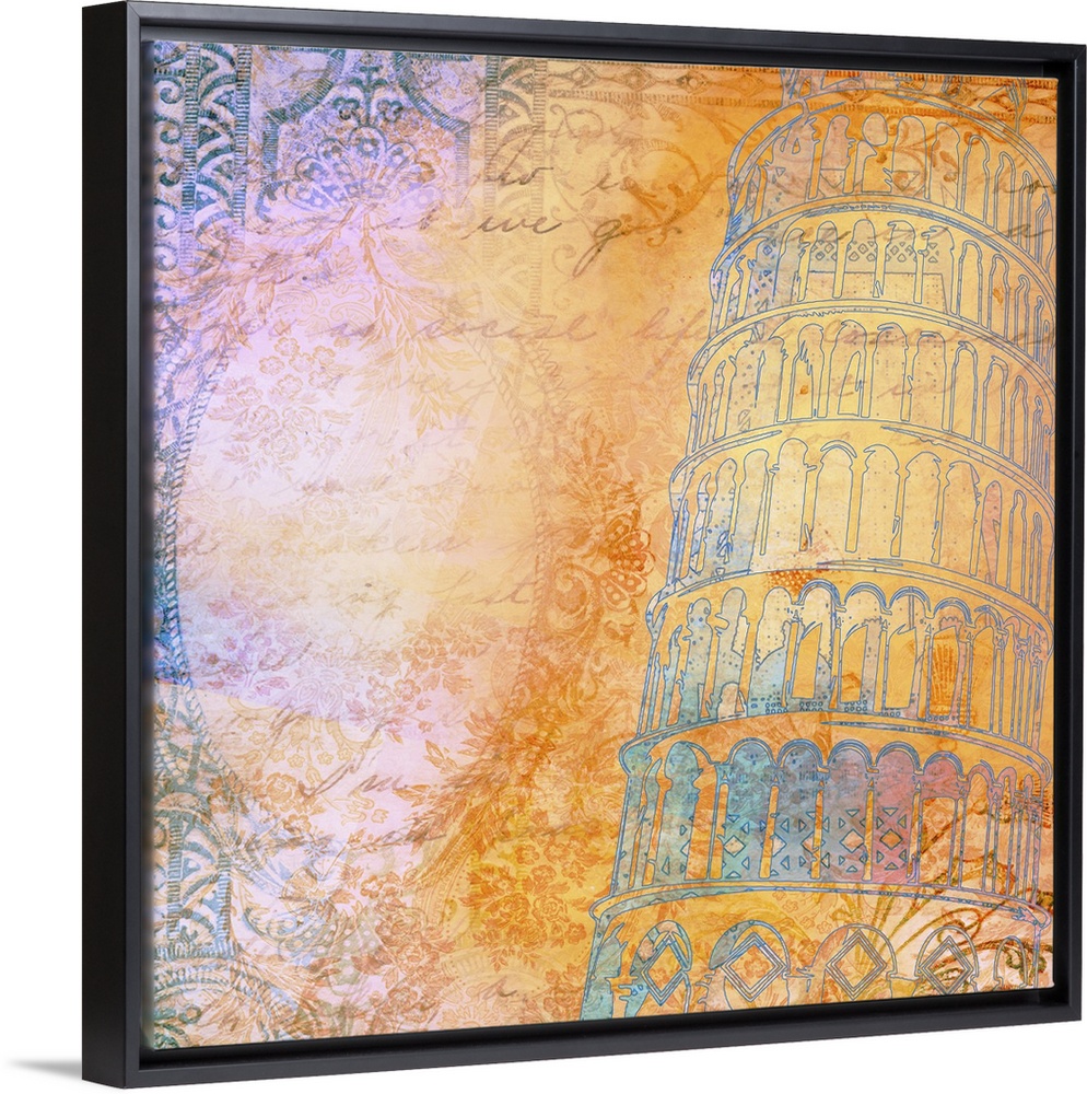 <p>Contemporary travel artwork of the Leaning Tower of Pisa, surrounded by ornate and decorative floral patterns.</p>