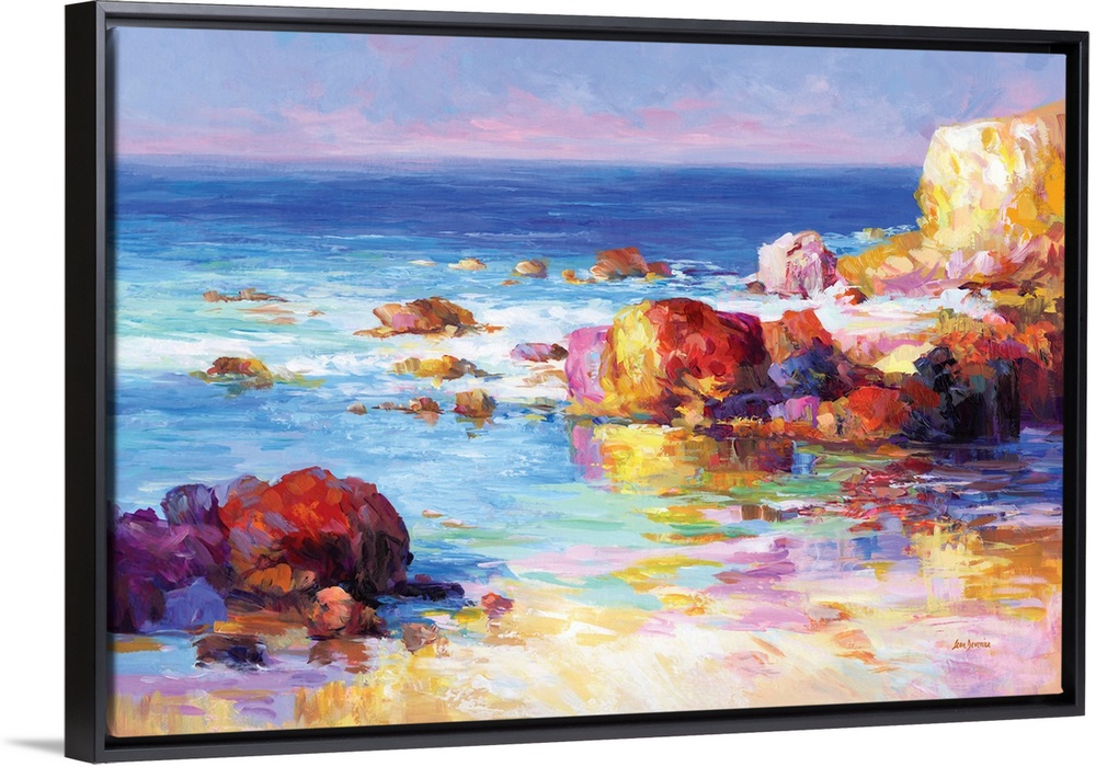 <p>A colorful seascape artwork featuring a sunlit shoreline, vibrant coastal rocks, and gentle waves shimmering with bright reflections. Warm yellows, pinks, reds, and cool blues blend together to create a lively, glowing atmosphere along the water's edge. This artwork brings a fresh, radiant touch to any home, perfect for anyone who loves coastal beauty, color, and peaceful seaside light.</p>
