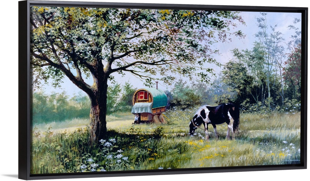 <p>Contemporary painting of a black and white horse grazing on lush greens near a gypsy train car.</p>