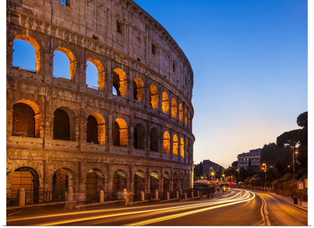 <p>Rome Colosseum (Flavian Amphitheatre) at night with light trail, UNESCO World Heritage Site, Rome, Lazio, Italy, Europe</p>