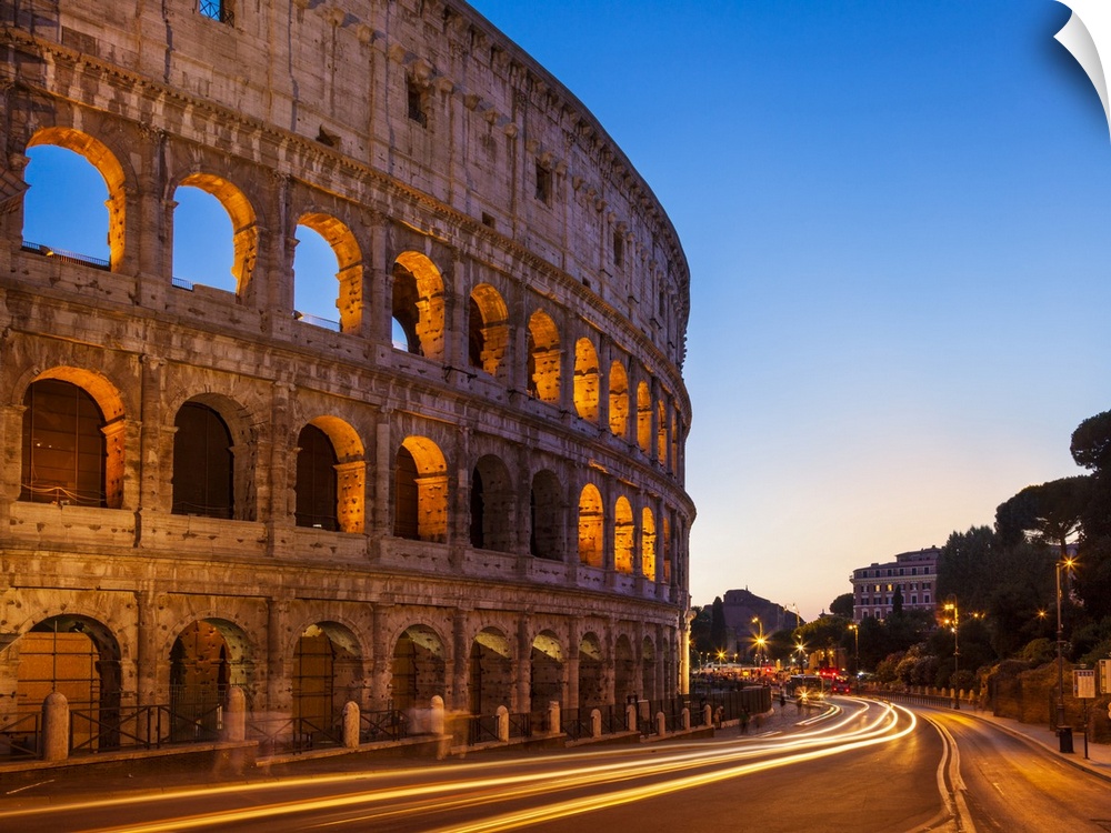 <p>Rome Colosseum (Flavian Amphitheatre) at night with light trail, UNESCO World Heritage Site, Rome, Lazio, Italy, Europe</p>