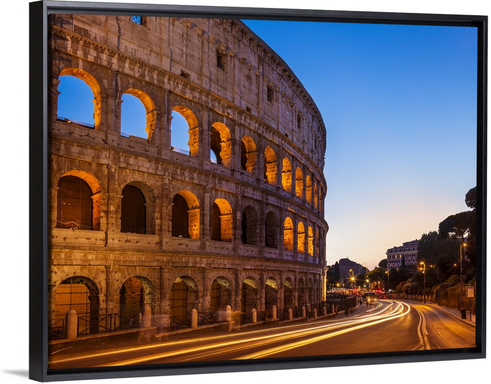 <p>Rome Colosseum (Flavian Amphitheatre) at night with light trail, UNESCO World Heritage Site, Rome, Lazio, Italy, Europe</p>