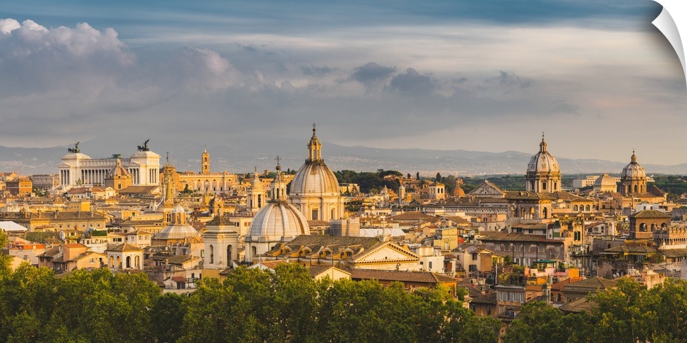 <p>Rome, Lazio, Italy. High angle view over the old town's cupolas and the Altar of the Fatherland (Altare della Patria).</p>