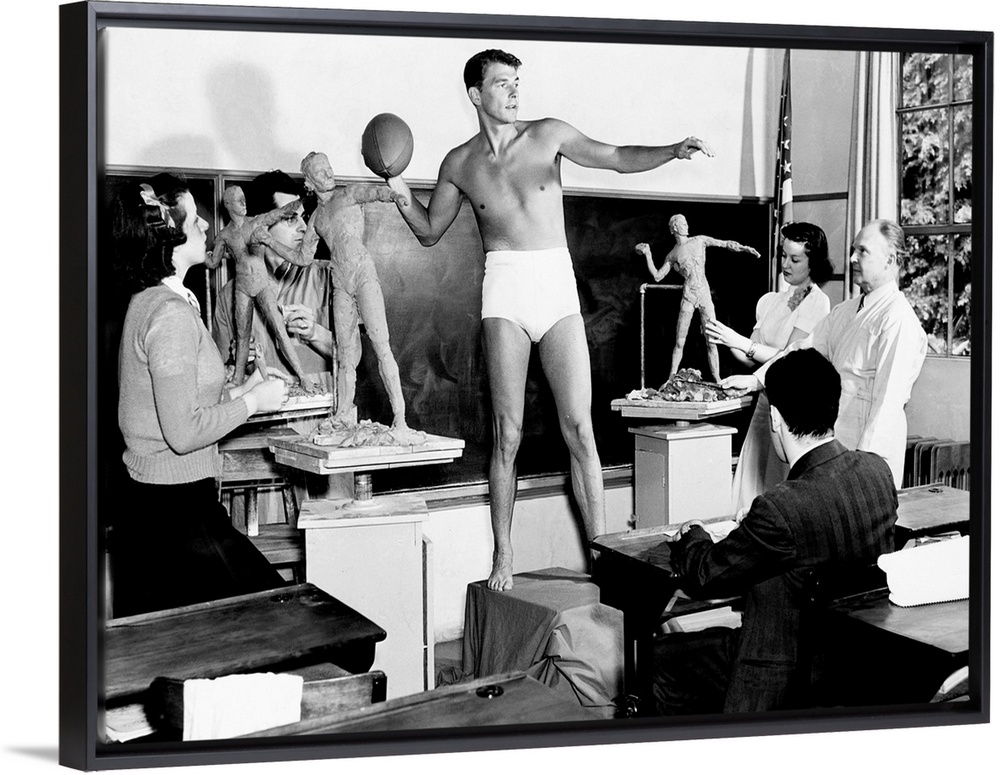 <p>Warner Bros.' Ronald Reagan, corralled into posing for a University of Southern California sculpture class as a publicity stunt, 1940.</p>