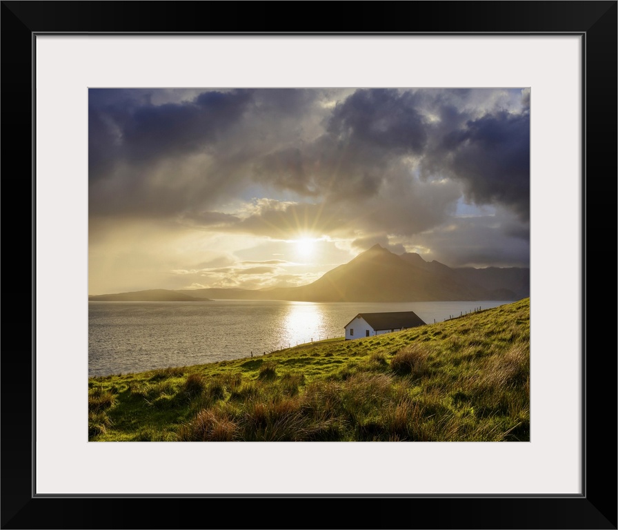 <p>Rooftop of a house along the Scottish coast with sun shining through the dramatic clouds over Loch Scavaig on the Isle of Skye in Scotland, United Kingdom</p>