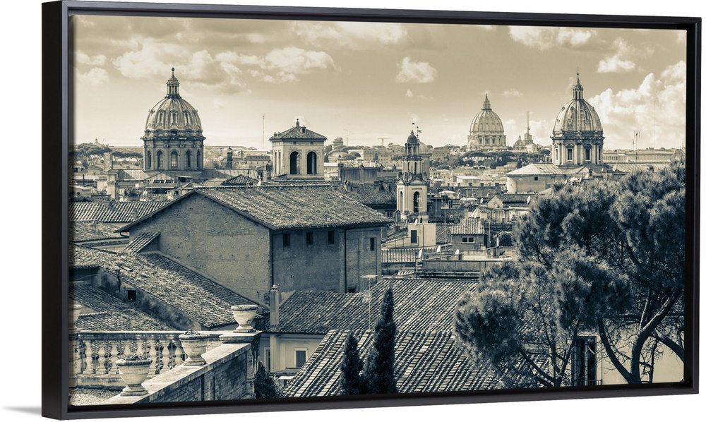 <p>Rome, Italy. Rooftops and domes. In the far distance is St. Peter's. The historic centre of Rome is a UNESCO World Heritage Site.</p>