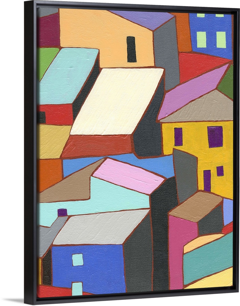 <p>Painting of colorful buildings and rooftops.</p>