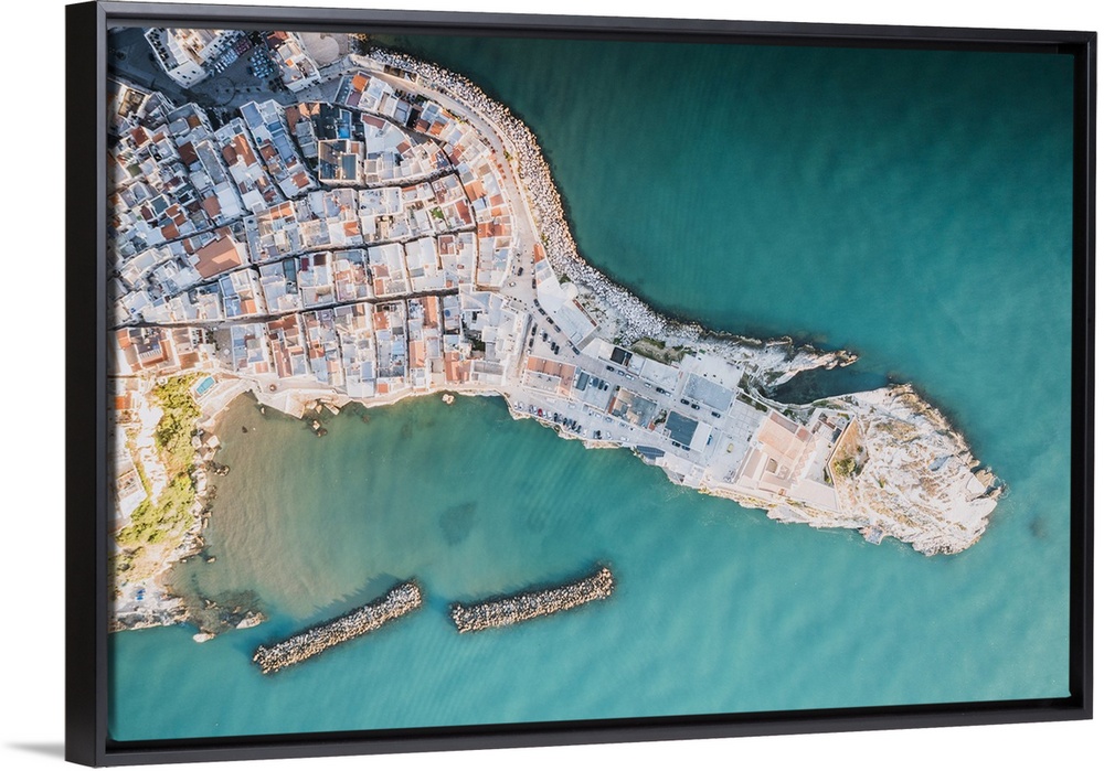 <p>Rooftops of white buildings by the turquoise sea from above, Vieste, Foggia province, Gargano, Apulia, Italy, Europe</p>
