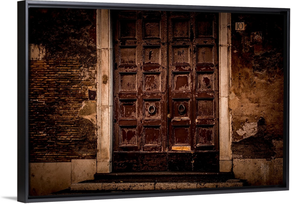 <p>Photograph of large, old, wooden front doors on a run down facade.</p>