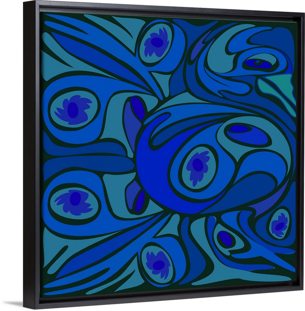 <p>A square design of abstract curved shapes and floral patterns within circles in shades of blue.</p>