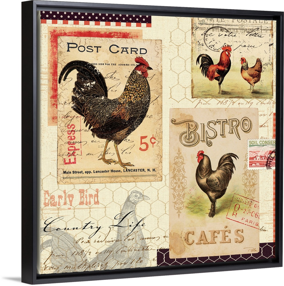 <p>Contemporary artwork of different postage stamps with roosters on them.</p>