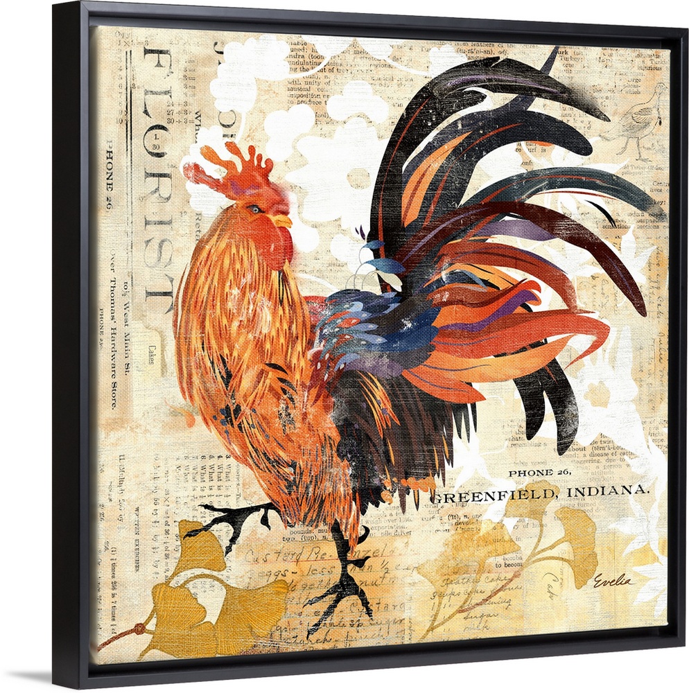 <p>Contemporary home decor artwork of a rooster with a colorful plumage, against an abstract background.</p>