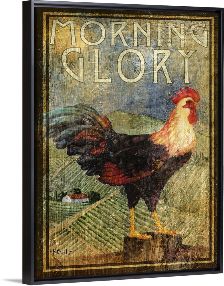 <p>Rustic-style sign for a farm with a rooster and the words Morning Glory.</p>