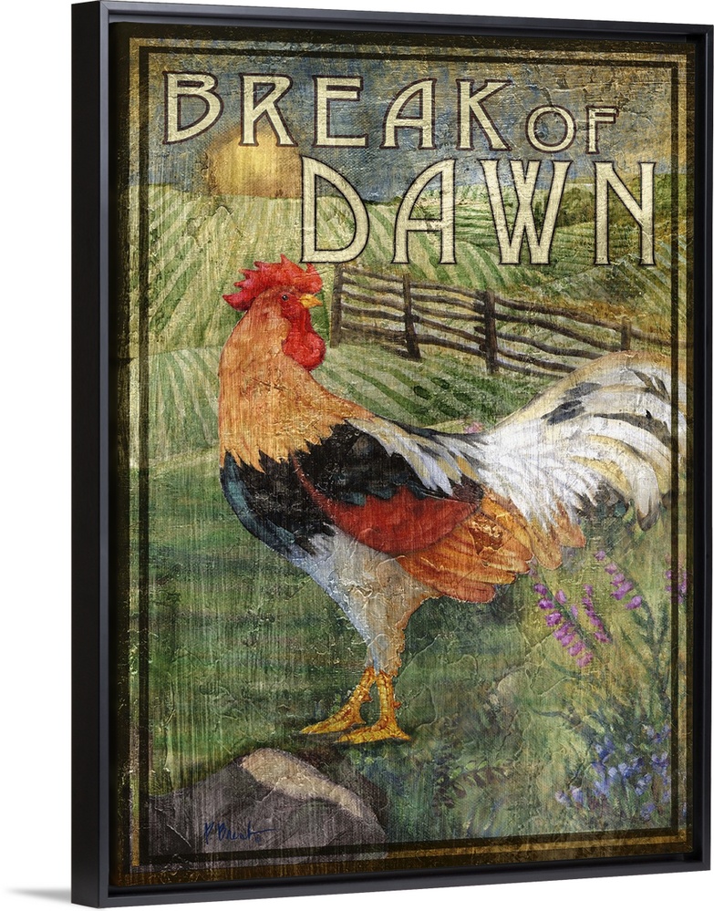 <p>Rustic-style sign for a farm with a strutting rooster and the words Break of Dawn.</p>