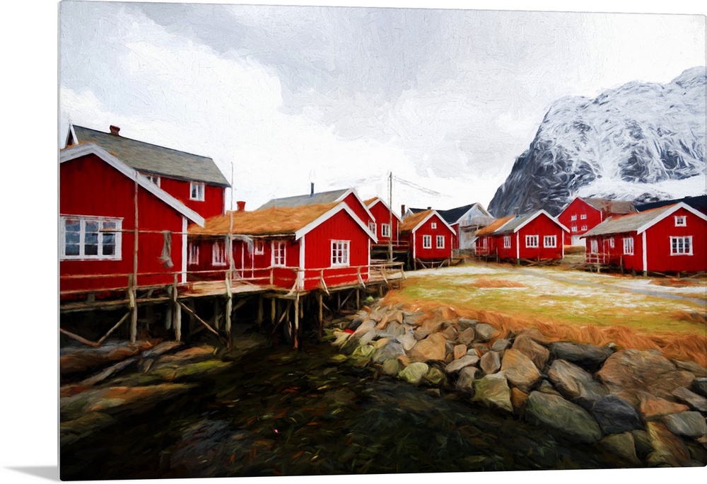 <p>A photograph of a red building village in a mountain landscape.</p>