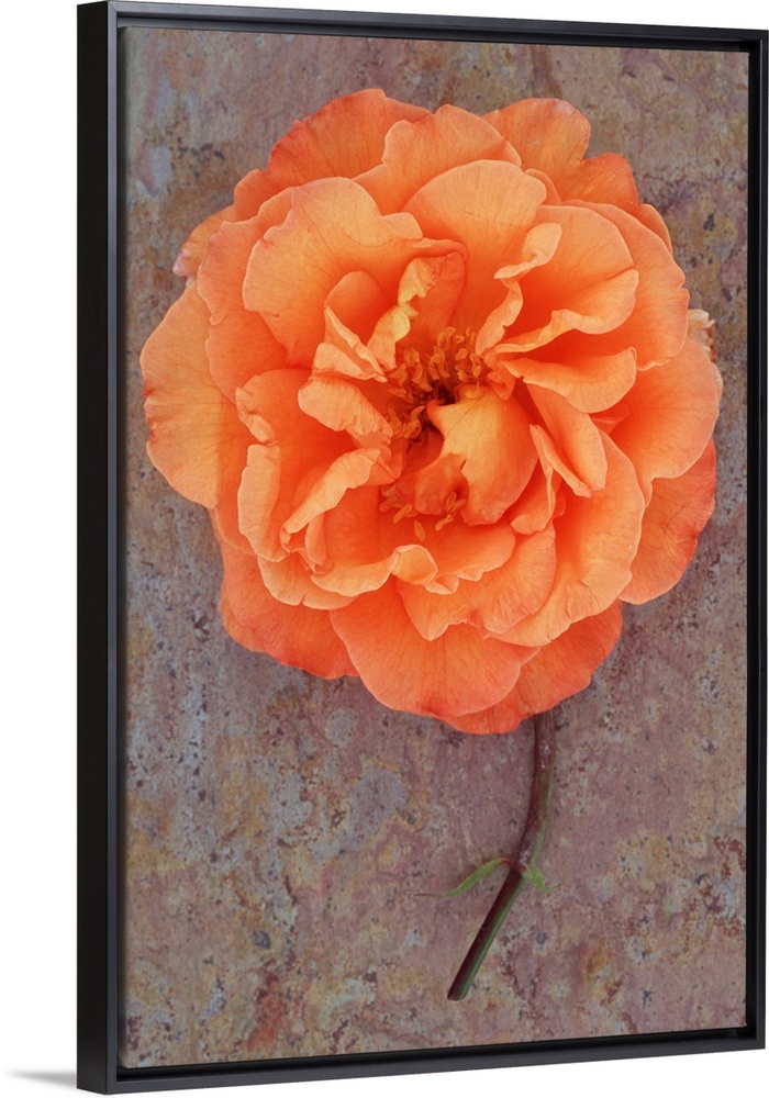 <p>Single orange bloom of Rose or Rosa Sallys lying with its stem on marbled slate with pink tone</p>