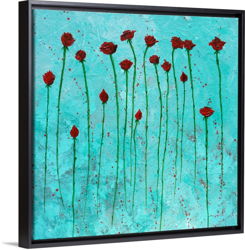 <p>Square painting of red roses with long green stems on an aqua background with red paint splatter.</p>