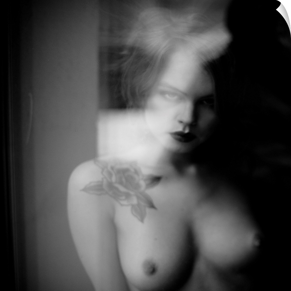 <p>Soft focus black and white portrait of a nude woman from the chest up with a rose tattoo.</p>