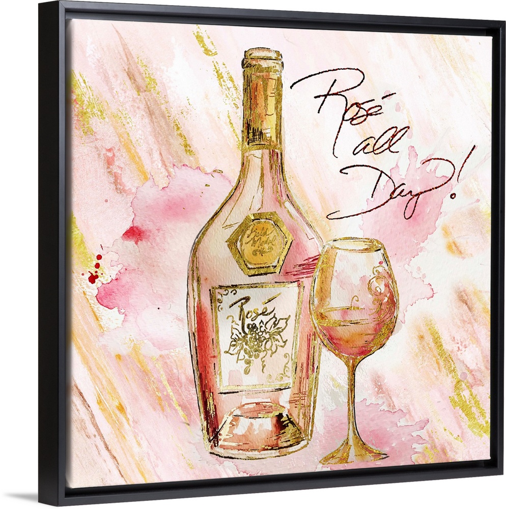 <p>Decorative artwork of a wine bottle and glass against pink and gold streaks and the text "Rose All Day!" in gold.</p>