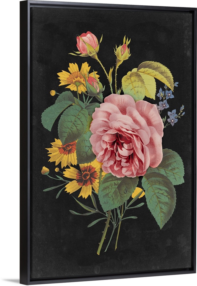 <p>Vintage stylized floral bouquet in an illustrative style, against a black background.</p>