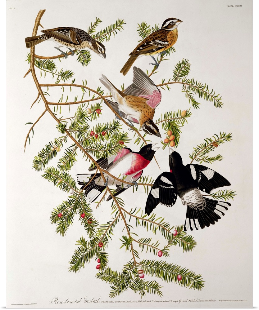 <p>Rose-breasted Grosbeak, from 'Birds of America', engraved by Robert Havell (1793-1878) (coloured engraving); by Audubon, John James (1758-1851) (after)</p>