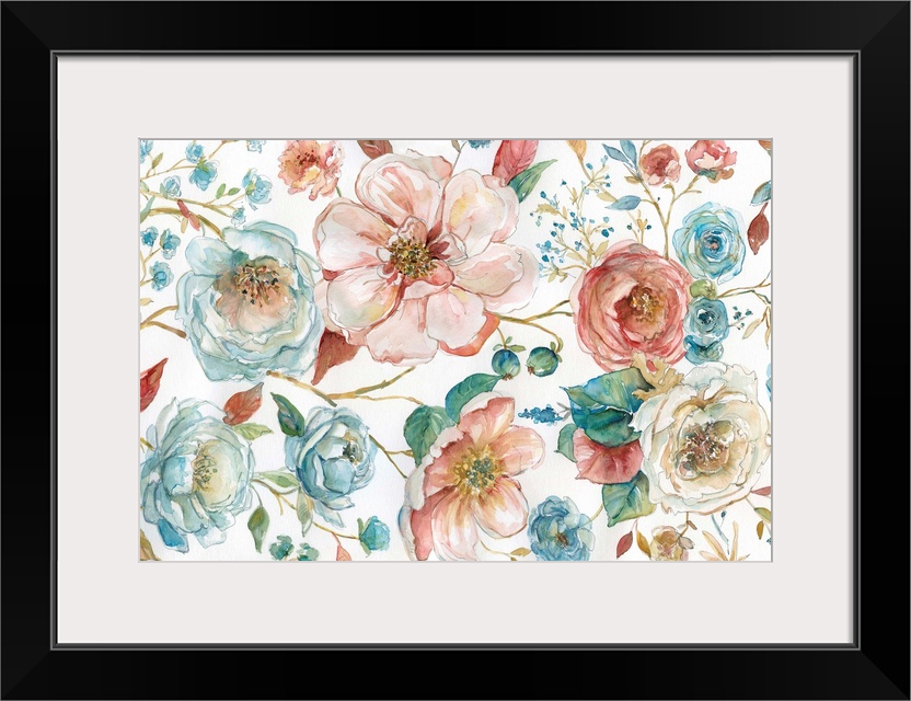 <p>Large watercolor painting of flowers in pink and blue tones on a white background.</p>
