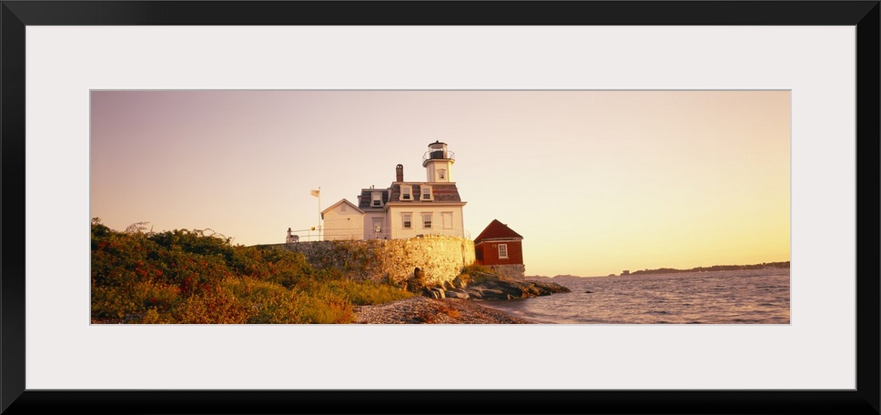 <p>Panoramic photograph on a big canvas of the Rose Island lighthouse overlooking the water at sunset, in Newport, Rhode Island.</p>