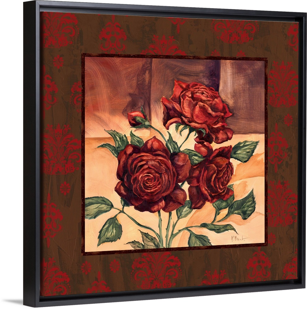 <p>Square painting of three roses with a border of damask-style flowers.</p>