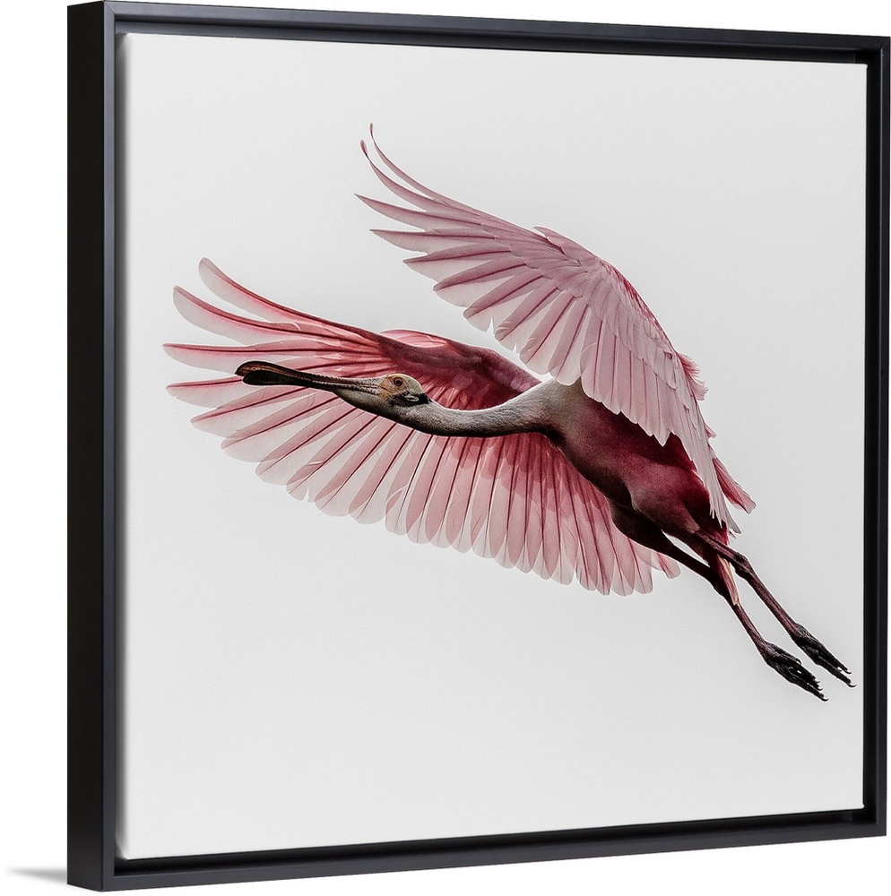 <p>A Roseate Spoonbill in mid-flight, with its wings outstretched.</p>