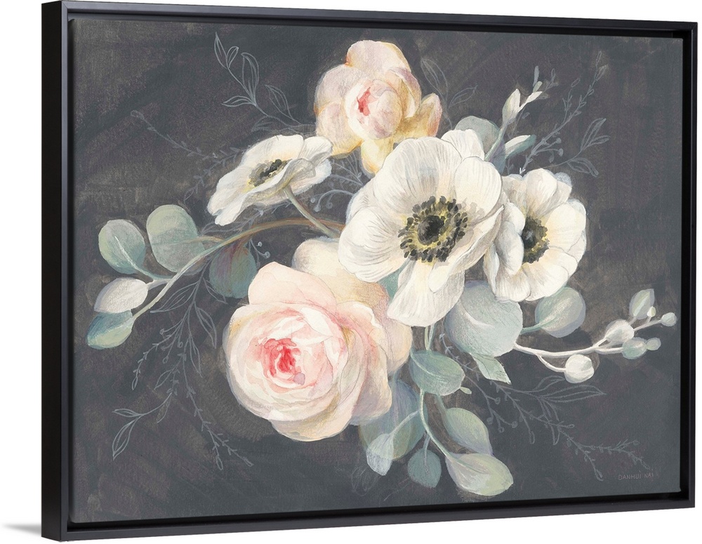 <p>A decorative artwork of a group of Roses and Anemones on a gray background.</p>