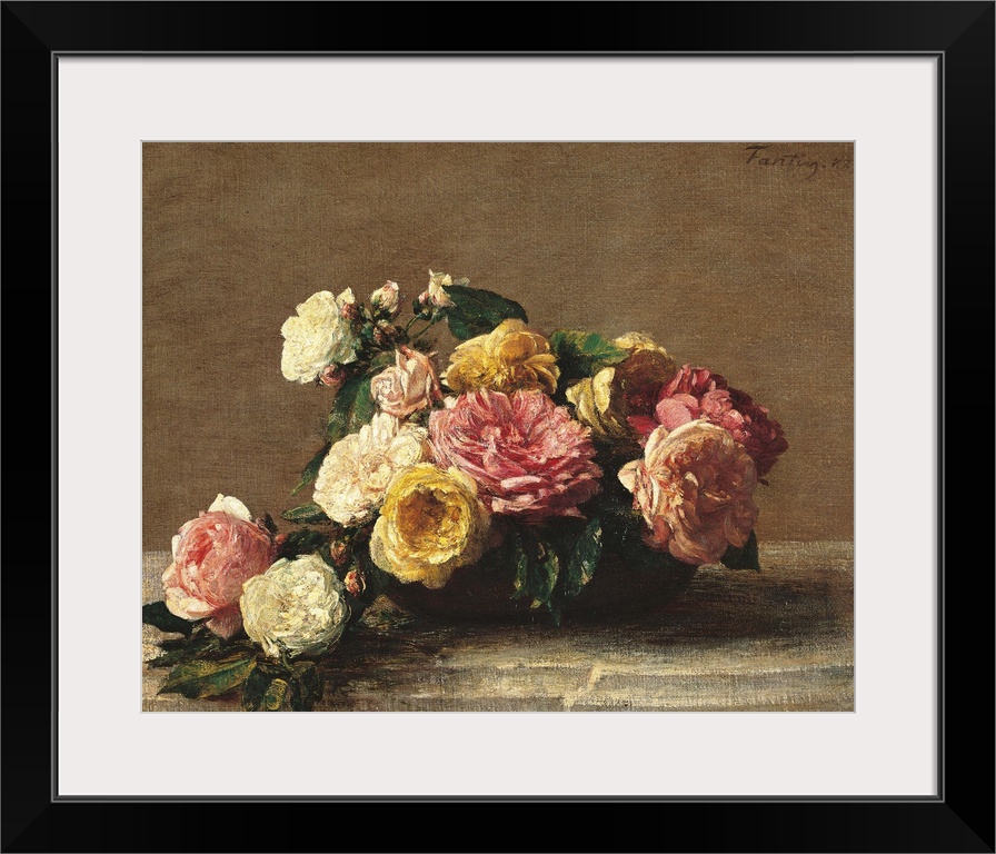 <p>Roses in a Bowl, by Henri Fantin-Latour, 1882, 19th Century, oil on canvas, cm 36,5 x 46 - France, Ile de France, Paris, Muse dOrsay. All. Roses bowl leaf flowers table yellow pink green white gray bunch. (251217) Everett Collection\Mondadori Portfolio</p>