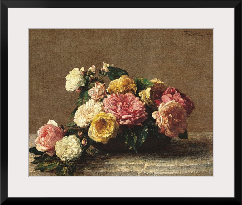 <p>Roses in a Bowl, by Henri Fantin-Latour, 1882, 19th Century, oil on canvas, cm 36,5 x 46 - France, Ile de France, Paris, Muse dOrsay. All. Roses bowl leaf flowers table yellow pink green white gray bunch. (251217) Everett Collection\Mondadori Portfolio</p>