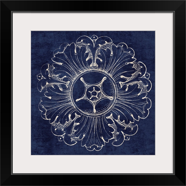 <p>Contemporary artwork of a vintage stylized rosette in dark blue.</p>