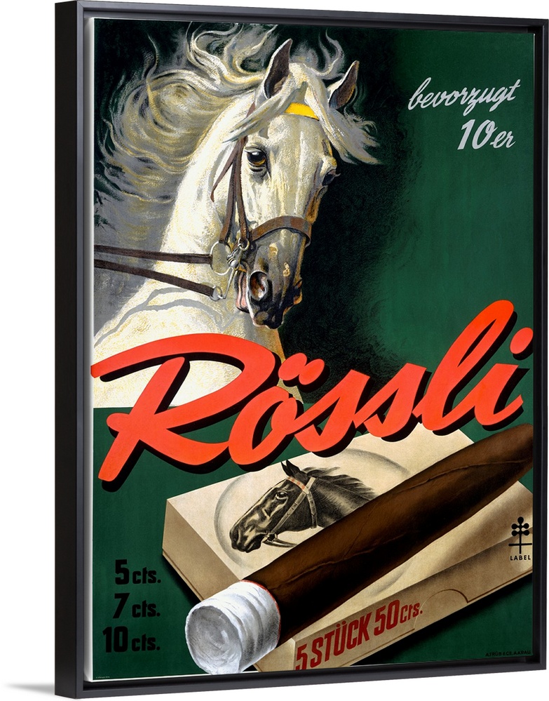<p>Vintage advertisement for Rossli Cigars featuring a large white horse.</p>