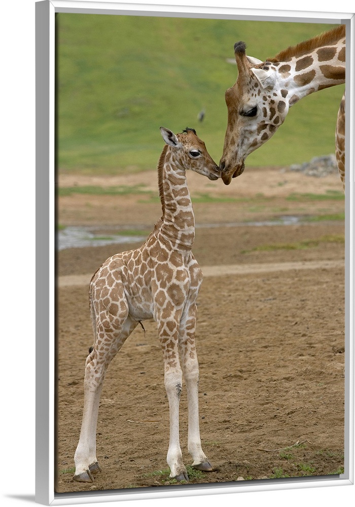 <p>Vertical canvas of a baby giraffe standing up and touching noses with it's parent.</p>