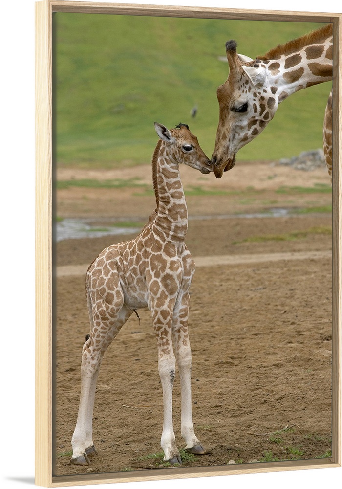<p>Vertical canvas of a baby giraffe standing up and touching noses with it's parent.</p>