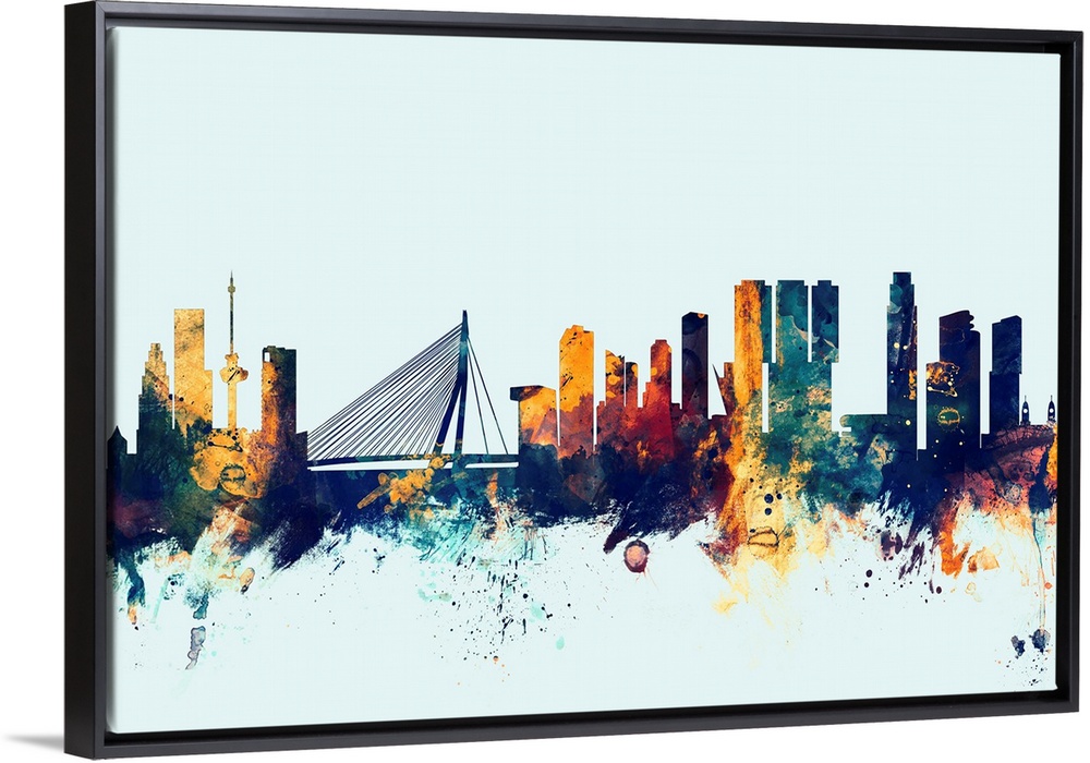 <p>Dark watercolor silhouette of the Rotterdam city skyline against a light blue background.</p>